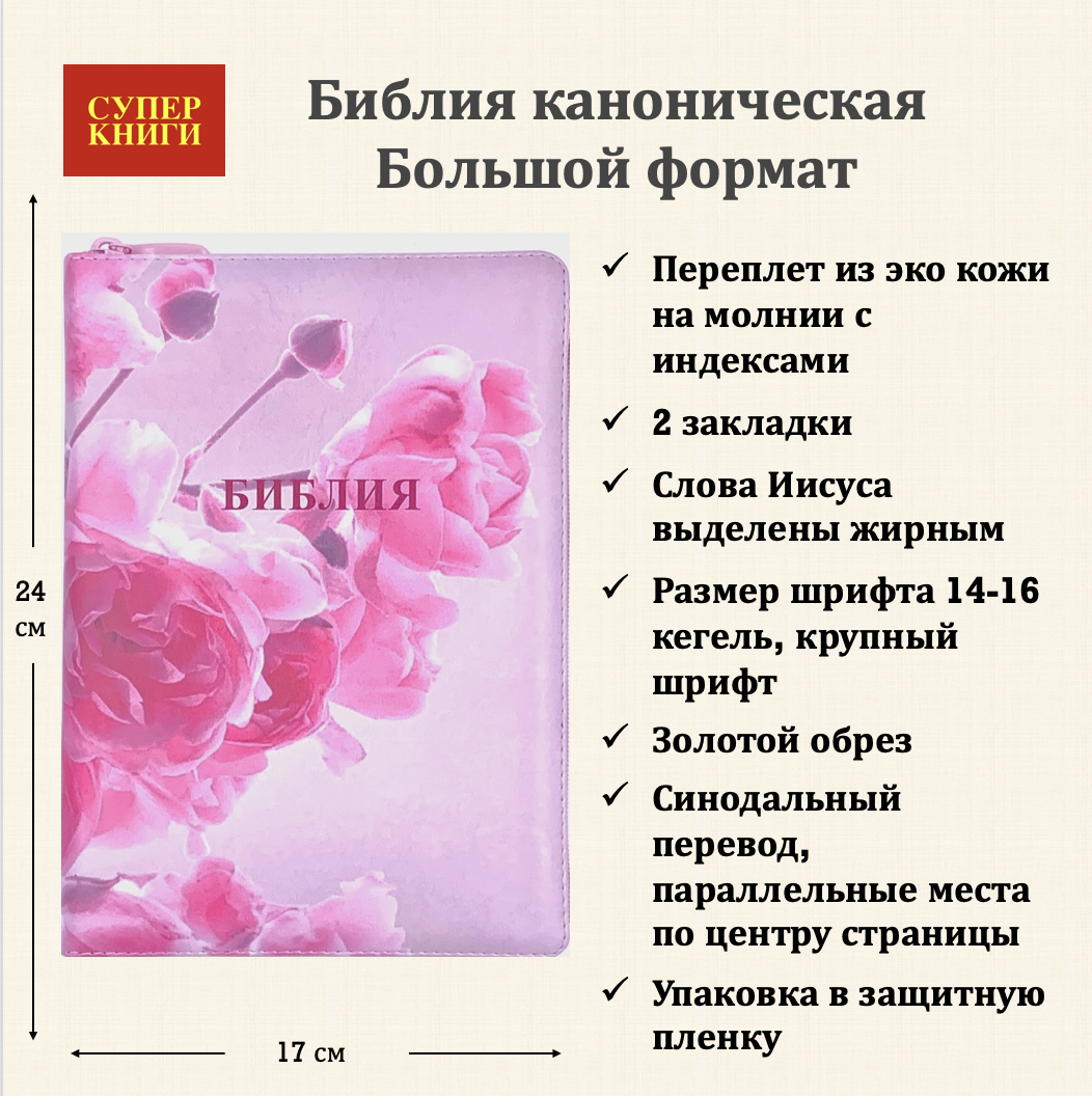 Интернет-магазин «Супер Книги» предлагает библии большого формата с оригинальным дизайном класса люкс, а также подарочные издания. Переплет на молнии, золотой обрез, индексы для поиска книг в Библии, стандартное расположение книг, набор в две колонки, синодальный перевод. Большой выбор библий в кожаных обложках от классических (черных, синих, бордо) до ультра модных принтов (пейзажи, цветы, термо печать). Большие библии отличаются крупным шрифтом. Отличный подарок для тех, кто ценит свое зрение